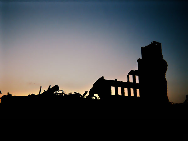 a photograph of an old burned factory in Owosso, MI. according to local kids playing and riding bikes on this hot summer evening, this place used to make bombs, couches, and candy.